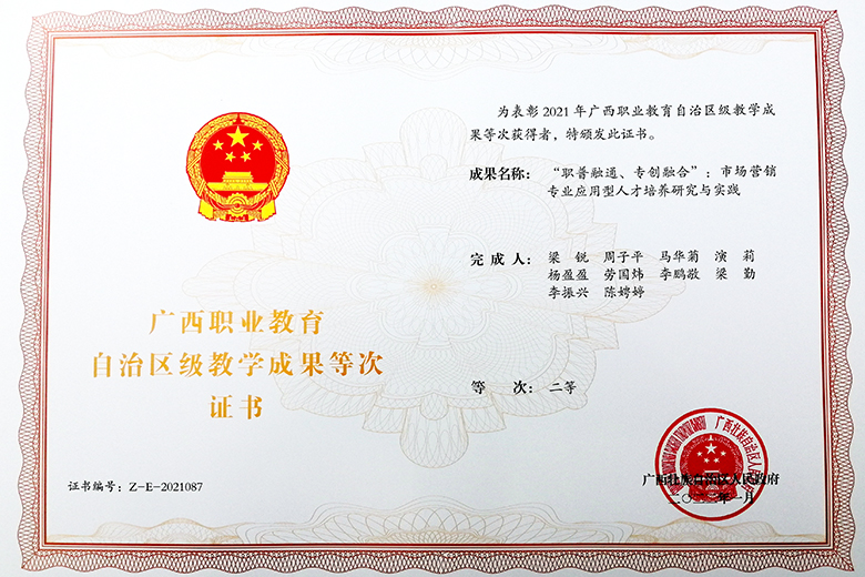 近日,自治区教育厅、自治区人力资源和社会保障厅下发《关于公布2021年广西职业教育自治区级教学成果等次评定结果的通知》。beat365南宁分校梁锐老师主持的《“职普融通、专创融合”:市场营销专业应用型人才培养研究与实践》项目喜获广西职业教育自治区级教学成果二等奖,实现了南宁分校在职业教育教学成果上的新突破。