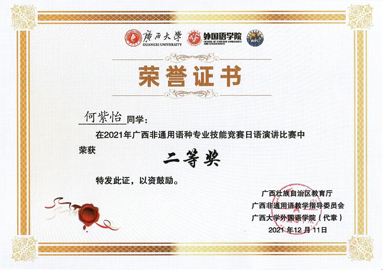 beat365何紫怡同学获得2021年广西通用语种专业技能竞赛日语演讲比赛高年级组二等奖