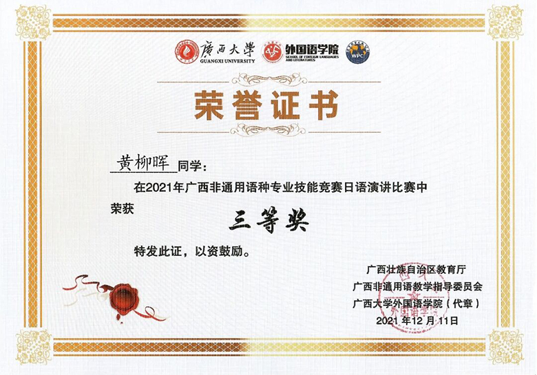 黄柳晖同学获得2021年广西通用语种专业技能竞赛日语演讲比赛高年级组三等奖