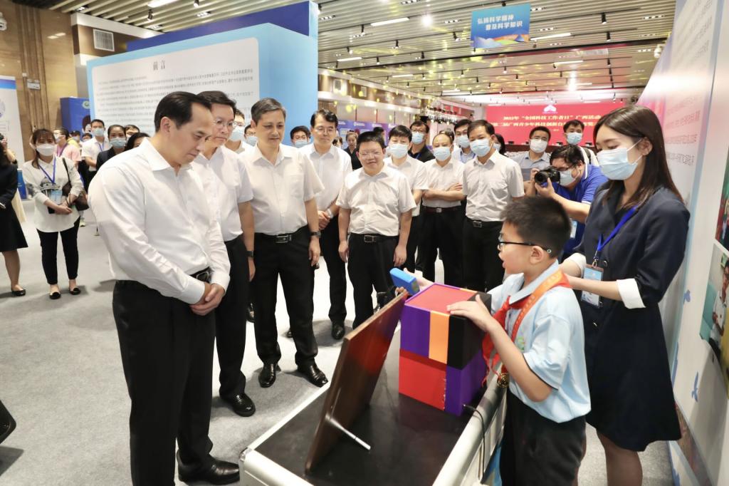 展览期间,自治区人民政府副主席许显辉,自治区政协副主席、自治区科协主席黄日波,自治区科技厅党组书记、厅长李国忠,自治区人民政府副秘书长罗掌华,自治区科协党组书记、副主席纳翔等参观了附属小学展区,饶有兴趣地听取了“智能充电电池存放柜”有关介绍,并勉励附属小学的学生在学习和实践中锻炼创新思维、提升创新能力,勇攀科学高峰,努力成长为祖国的栋梁之材。