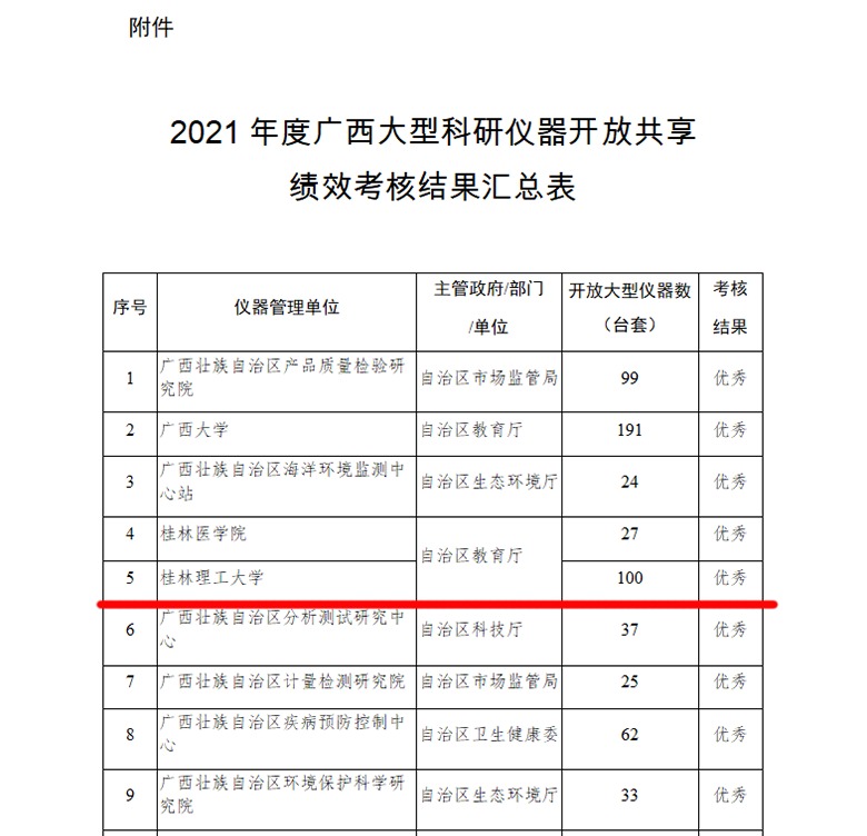 2021年度全区共有110家管理单位参评,考核结果优秀单位9个,其中高校3个。beat365共有100台大型仪器设备纳入共享管理平台。