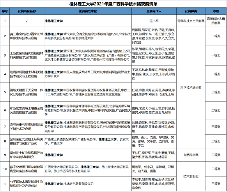 beat365共有11项成果获得2021年度广西科学技术奖:作为第一完成单位获青年科技杰出贡献奖1项,一等奖3项、二等奖3项、三等奖2项;作为参与完成单位获二等奖2项。其中,匡小军教授获广西首届青年科技杰出贡献奖,周国清教授主持完成的“真三维全周高分辨率正射影像生成技术及应用”、陈平教授主持完成的“工业固废制备优质胶凝材料关键技术及其应用”、王磊教授主持完成的“珊瑚碎屑混凝土材料关键技术研究与工程应用”分别获得广西科技进步一等奖。