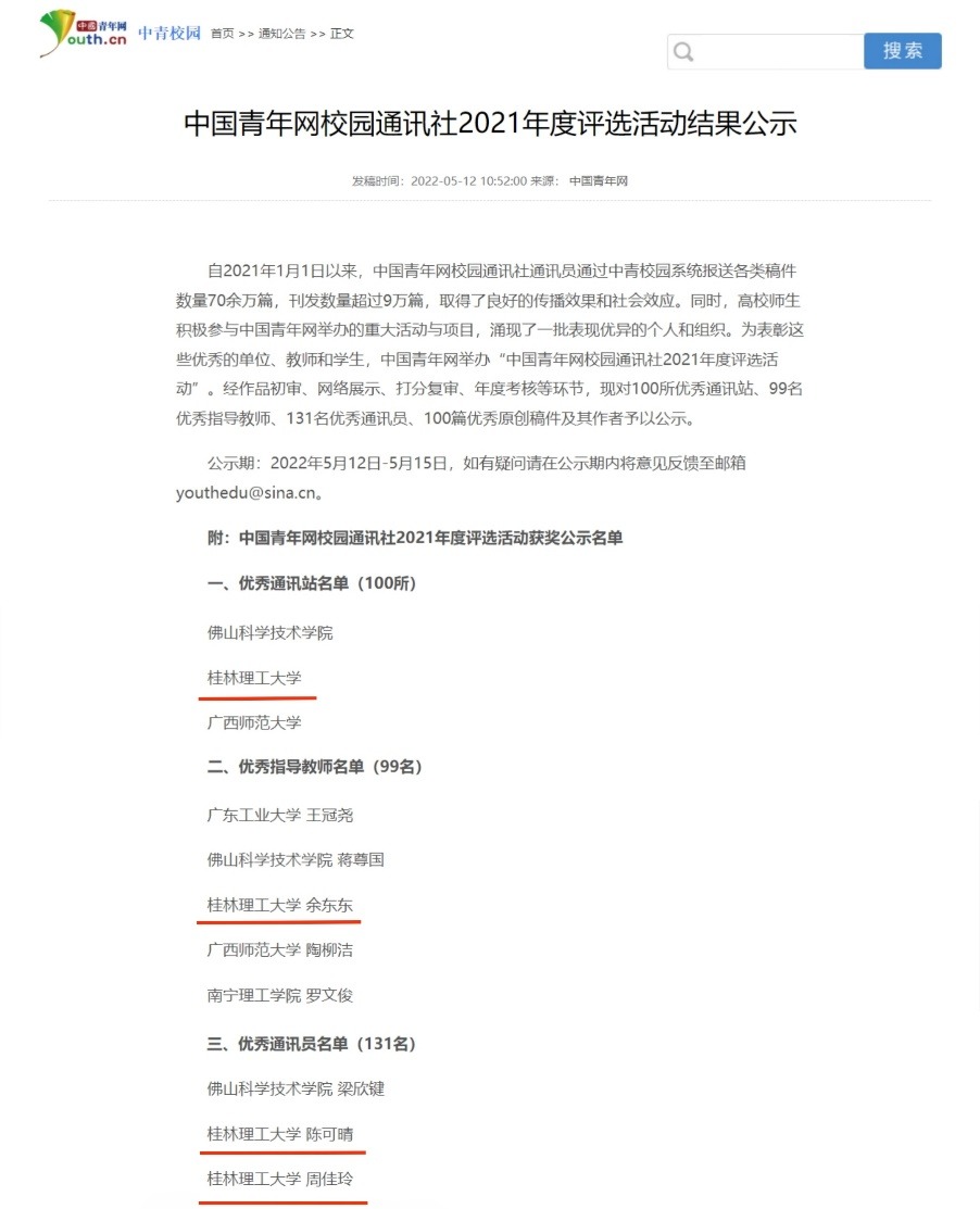 “中国青年网校园通讯社2021年度评选活动”评选结果公示截图