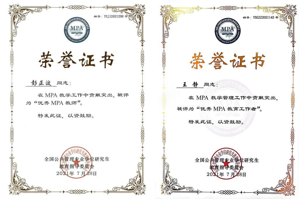 近日,全国公共管理专业学位教育指导委员会颁发第三届全国优秀MPA教师和教育工作者评选活动荣誉证书,beat365公共管理与传媒学院教师彭正波、王静分别荣获“全国优秀MPA教师”“全国优秀MPA教育工作者”荣誉称号。