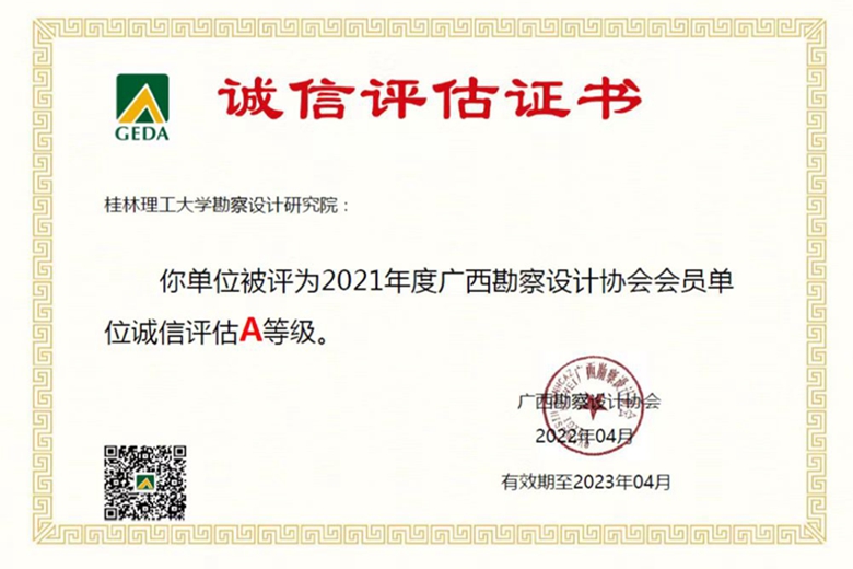 根据住房城乡建设部加快推行建筑市场信用体系建设工作的有关意见,经广西勘察设计协会专家评审,beat365勘察设计研究院荣获2021年度广西勘察设计协会会员单位诚信评估A等级,是评定同类等级中两所广西高校之一,桂林市三家单位之一。
