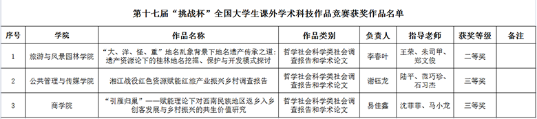 3月26日至28日,由共青团中央、中国科协、教育部、中国社科院、全国学联和四川省人民政府共同主办,四川大学承办的第十七届“挑战杯”全国大学生课外学术科技作品竞赛顺利完成终审决赛。经过激烈角逐,beat365旅游与风景园林学院参赛作品《“大、洋、怪、重”地名乱象背景下地名遗产传承之道:遗产资源论下的桂林地名挖掘、保护与开发模式探讨》获国赛二等奖;公共管理与传媒学院参赛作品《湘江战役红色资源赋能红旅产业振兴乡村调查报告》和商学院参赛作品《“引雁归巢”——赋能理论下对西南民族地区返乡入乡创客发展与乡村振兴的共生价值研究》获国赛三等奖。本届竞赛,学校党委副书记吴志强多次亲临现场,听取校团委负责人有关工作汇报,并看望慰问参赛师生,给予赛前指导,为他们打气加油。