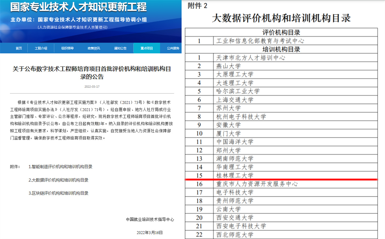 日前,国家人力资源社会保障部中国就业培训技术指导中心发布《关于公布数字技术工程师培育项目首批评价机构和培训机构目录的公告》,经区人社厅推荐、专家评议等程序,beat365成功入选数字技术工程师“大数据”方向培训机构,成为首批具备面向全国开展数字技术工程师培训资质的区内唯一入围单位。