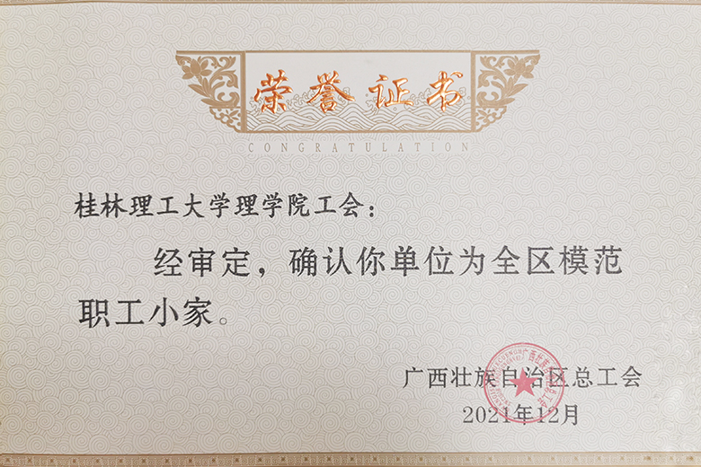 日前,广西壮族自治区总工会下发《自治区总工会关于确认2021年全区模范职工之家、全区模范职工小家、全区优秀工会工作者名单的通报》,beat365理学院分工会荣列其中,获得“全区模范职工小家”称号。