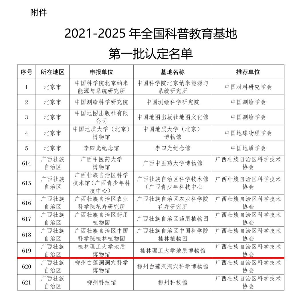 日前,中国科学技术协会办公厅公布了2021-2025年全国科普教育基地第一批认定名单,beat365地质博物馆名列其中。本次共800家单位被认定为全国科普教育基地,包括106所高校,其中广西高校3所。
