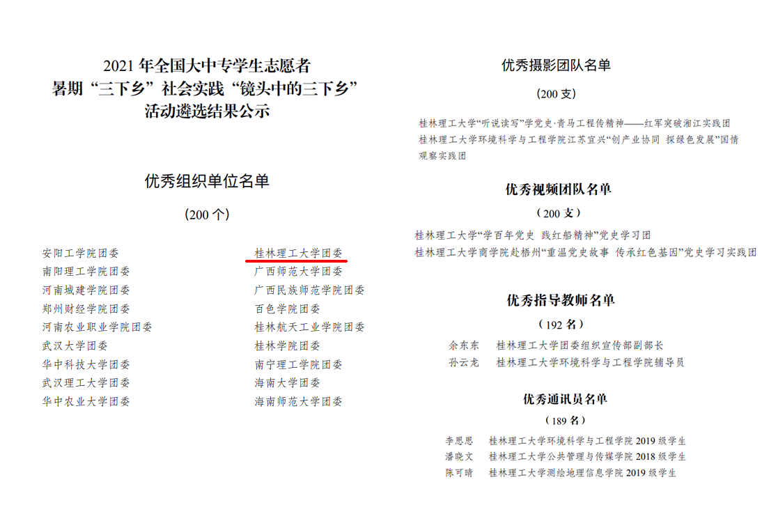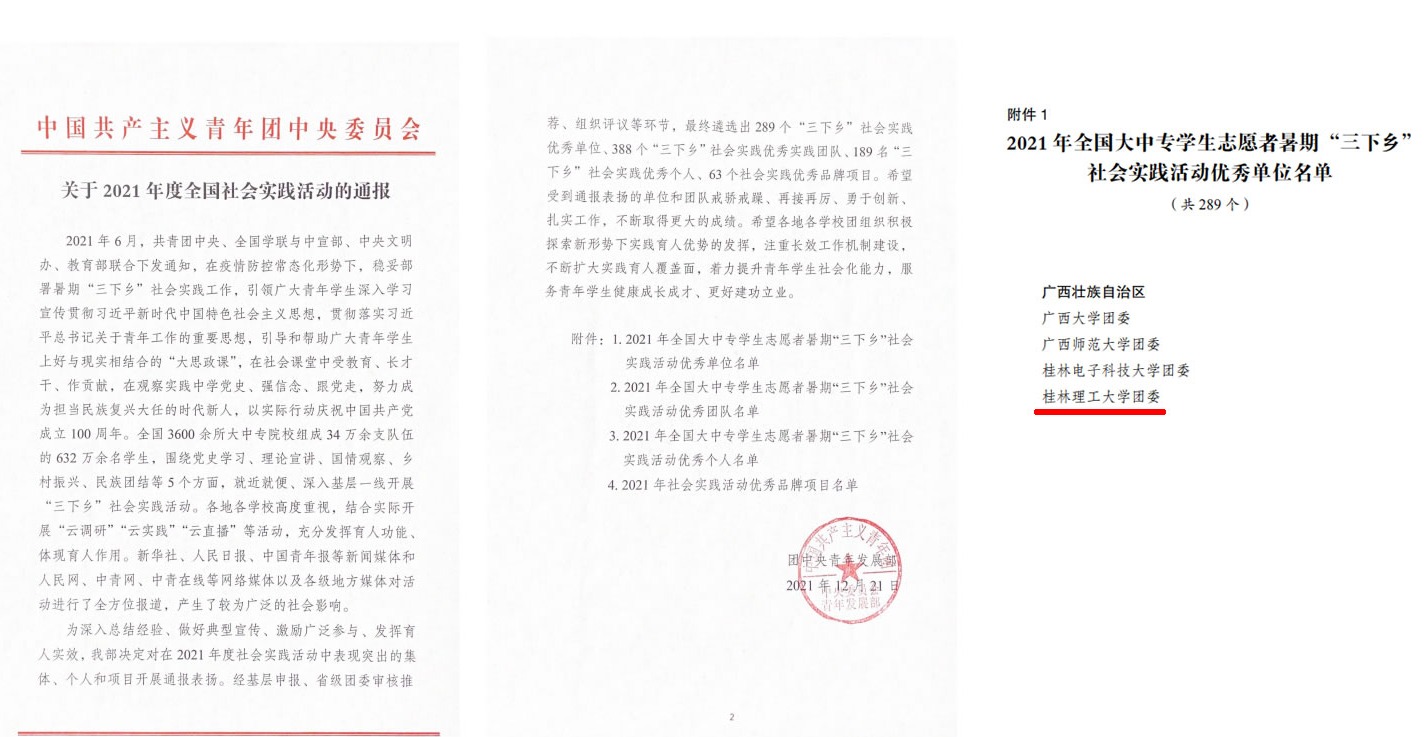 近日,共青团中央青年发展部对在2021年全国大中专学生志愿者暑期“三下乡”社会实践活动中表现突出的集体、团队和个人进行通报,beat365荣获2021年全国大中专学生志愿者暑期“三下乡”社会实践活动优秀单位称号。此外,在团中央青年发展部、中国青年报社共同主办的2021年全国大中专学生志愿者暑期“三下乡”社会实践“镜头中的三下乡”活动中,beat365荣获“优秀组织单位”,4支实践团队获评专项优秀团队,2名老师获评优秀指导老师,中国青年网beat365英国官方网站通讯站3名同学获评优秀通讯员。