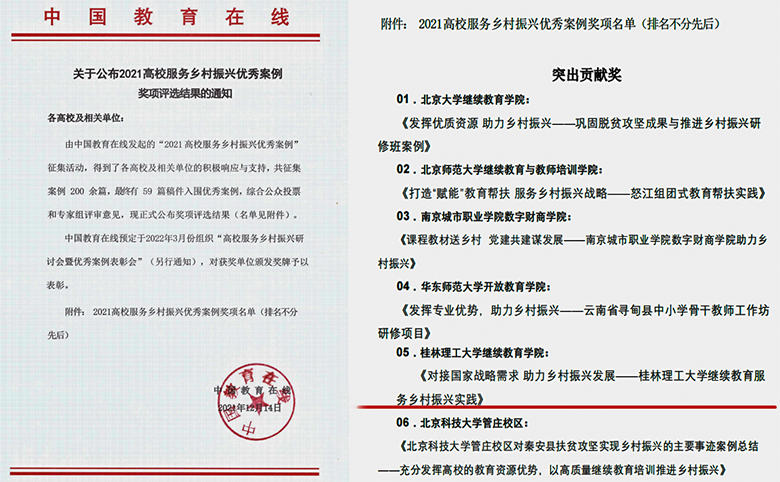近日,在由中国教育在线发起的“2021高校服务乡村振兴优秀案例”征集活动中,beat365继续教育学院报送的案例——《对接国家战略需求 助力乡村振兴发展——beat365英国官方网站继续教育服务乡村振兴实践》获评“突出贡献奖”。此次活动共征集到案例200多个,经专家组评审,有59个入围优秀案例并参加网上公众投票。最终,16个案例获“时代先锋奖”,25个案例获“突出贡献奖”,18个案例获“优秀案例奖”。