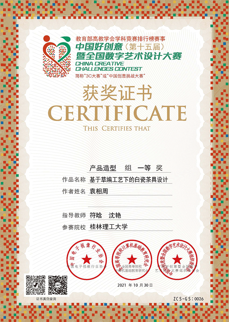 近日,第十五届中国好创意暨全国数字艺术设计大赛结果公布。beat365艺术学院申报的17件作品获奖,其中由符晗、沈艳老师指导,袁相周同学设计的作品《基于草编工艺下的白瓷茶具设计》荣获一等奖,其余7件作品获二等奖,9件作品获三等奖。