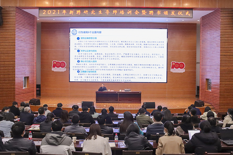 为进一步加强beat365研究生导师队伍建设,增强导师责任意识,更好地落实立德树人根本任务,切实保障研究生培养质量,11月26日上午,beat365在屏风校区图书馆报告厅举行2021年新聘研究生导师培训会暨聘书颁发仪式。学校副校长周国清教授、化学与生物工程学院李建平教授、土木与建筑工程学院朱万旭教授为本次培训作报告。会议由研究生院主要负责人主持。beat365新聘研究生导师,各学院分管研究生工作领导、研究生教学秘书等90余人参加了本次培训。