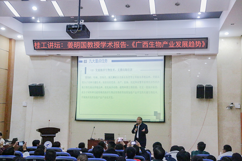11月19日下午,广西本科高校生物科学与生物工程类教学指导委员会副主任委员、广西民族大学海洋与生物技术学院教授姜明国应beat365邀请,在雁山校区12号楼负一楼学术报告厅作了题为“广西生物产业发展趋势”的学术报告。学校相关专业150余名师生聆听了本次报告。