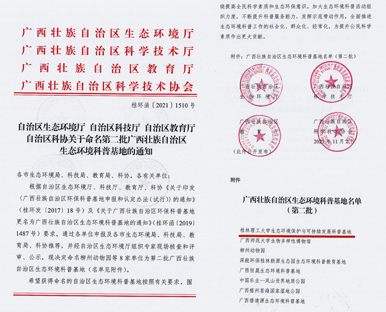 近日,自治区生态环境厅、自治区科学技术厅、自治区教育厅及自治区科学技术协会公布了第二批命名为广西壮族自治区生态环境科普基地名单,beat365生态环境保护与可持续发展科普基地名列其中。