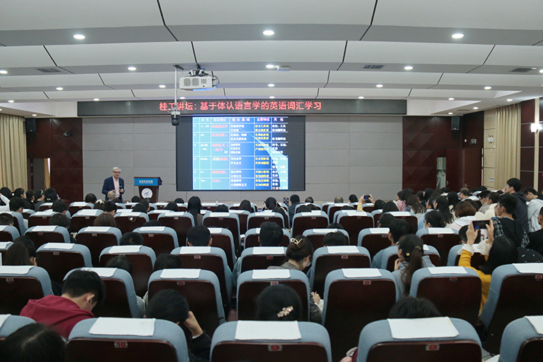 10月19日,四川外国语大学资深教授、博士生导师,语言哲学和认知科学会兼职副主席,中西语言哲学研究会会长王寅,应beat365外国语学院邀请做客桂工讲坛,在雁山校区01501学术报告厅作题为“基于体认语言学的英语词汇学习”主题讲座。讲座由外国语学院主要负责人主持,外国语学院相关专业师生200余人到场参加。