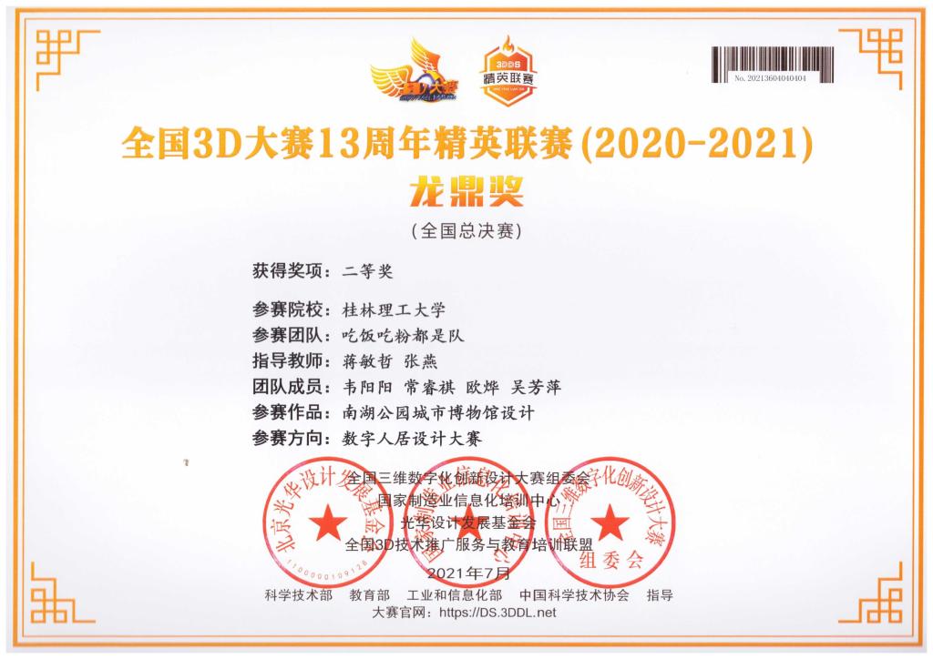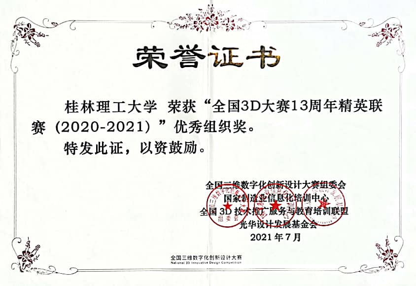 近日,2021全国3D大赛13周年精英联赛全国总决赛落下帷幕, 结合当前疫情防控形势,总决赛采用了线上为主的方式进行。本次大赛共有来自全国389所高校的5556支队伍参赛,beat365以机械与控制工程学院师生为主的代表队喜获全国一等奖1项、二等奖2项、三等奖5项,广西赛区特等奖8项、一等奖9项、二等奖19项、三等奖8项。同时,beat365荣获全国3D大赛13周年精英联赛优秀组织奖。
