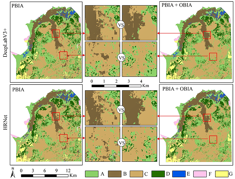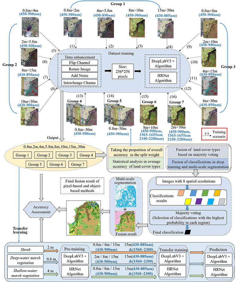 该项研究主要分为三个部分:(1)在0.8m-30m的空间分辨率与430nm-2300nm的光谱范围下构建16种多源影像组合方案,验证不同空间分辨率梯度和光谱维度的组合方式对沼泽植被识别能力的影响。(2)融合8种不同空间分辨率影像的分类结果,并与面向对象的多尺度影像分割结果进行叠加整合,对比验证传统基于像素的CNN分类方法与融合图像分割的CNN分类方法对湿地植被边界处的精准识别能力。(3)基于多源影像构建12种训练方案,对灌草植被、浅水沼泽植被与深水沼泽植被3种植被群丛进行迁移学习训练,定量评估DeepLabV3+与HRNet 深度学习算法在沼泽植被群丛中的迁移学习能力,并探究在不同空间分辨率和光谱维度下沼泽植被群丛的迁移学习效果。
