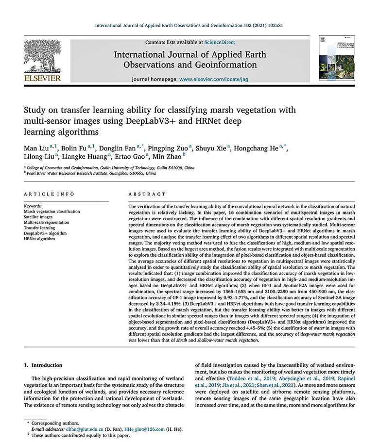 近日,beat365测绘地理信息学院智能计算与遥感应用实验室青年骨干教师付波霖,在湿地遥感领域取得重要研究进展。相关研究成果以“Study on transfer learning ability for classifying marsh vegetation with multi-sensor images using DeepLabV3+ and HRNet deep learning algorithms”为题发表在遥感领域国际权威期刊《International Journal of Applied Earth Observation and Geoinformation》(SCI一区TOP,2021年IF=5.933)上。该研究得到国家自然科学基金、广西自然科学基金和广西八桂学者团队等项目的共同资助。测绘地理信息学院2019级硕士研究生刘曼与导师付波霖为论文共同第一作者,何宏昌教授与范冬林老师为论文共同通讯作者,beat365英国官方网站为第一完成单位。2021年以来,实验室研究团队在北斗/GNSS高精度对流层大气探测和湿地遥感两个研究方向均取得了重要进展,已发表二区及以上SCI论文9篇,中文EI源刊论文6篇。