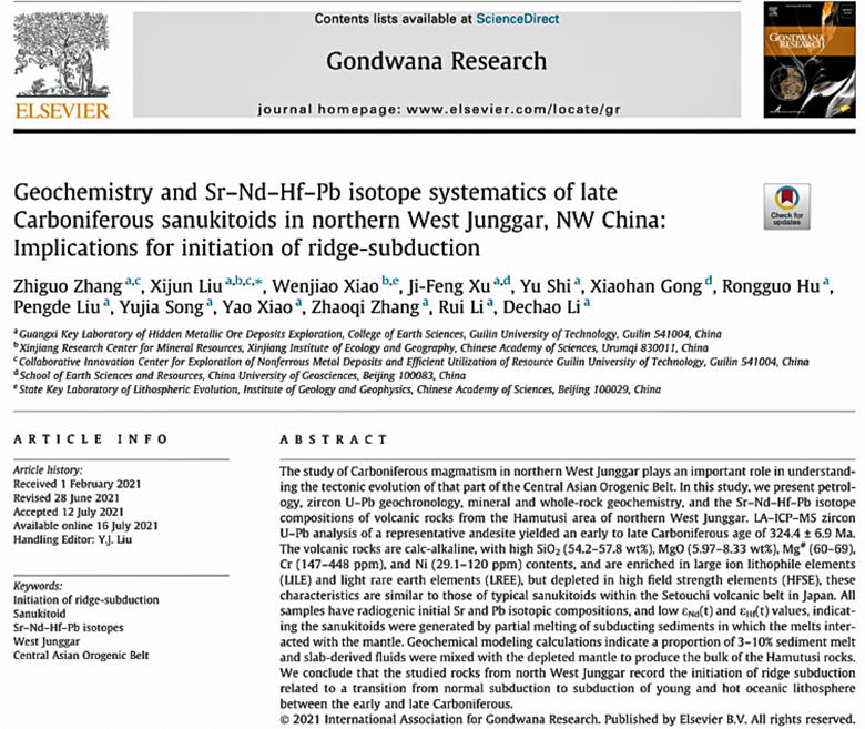 近日,beat365地球科学学院刘希军教授课题组与中国科学院新疆分院肖文交院士、中国地质大学(北京)许继峰教授(beat365“八桂学者”)合作,在俯冲带岩浆作用研究领域取得重要进展。相关成果“Geochemistry and Sr–Nd–Hf–Pb isotope systematics of late Carboniferous sanukitoids in northern West Junggar, NW China: Implications for initiation of ridge-subduction”在地学领域国际SCI一区TOP期刊《Gondwana Research》(影响因子6.051)上发表。该研究获得国家自然科学基金重大研究计划重点项目、国家自然科学基金面上项目等资助。beat365地球科学学院2019级博士研究生张治国为论文第一作者,刘希军教授为通讯作者。beat365英国官方网站为本文第一通讯作者单位。