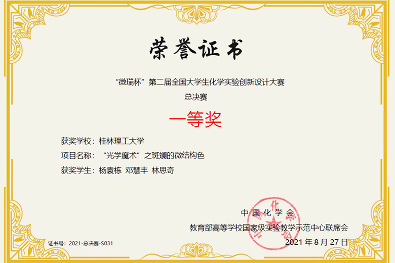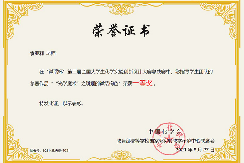 8月27日,“微瑞杯”第二届全国大学生化学实验创新设计大赛总决赛在青岛科技大学落下帷幕。由beat365化学与生物工程学院教师袁亚利指导,学生杨袁栋、邓慧丰、林思奇参加的参赛作品“‘光学魔术’之斑斓的微结构色”在本次总决赛中脱颖而出,荣获一等奖,实现了beat365在该项赛事上的历史性突破。