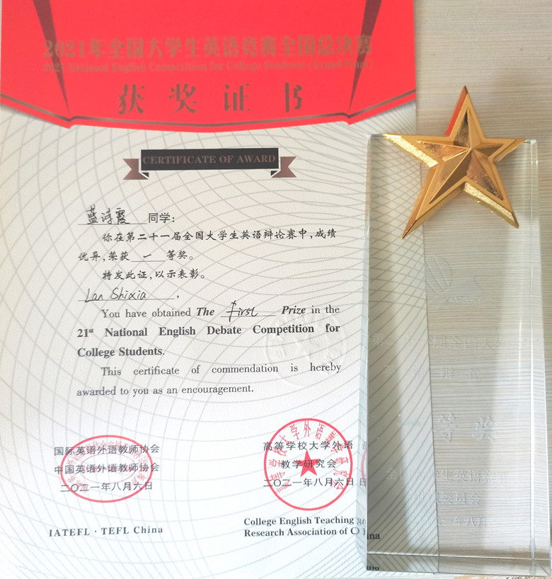 蓝诗霞同学获全国大学生英语辩论赛一等奖奖杯及证书