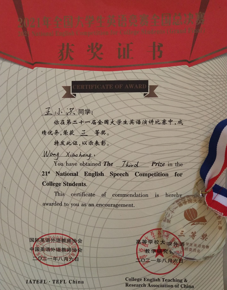 王小洪获演讲比赛三等奖证书及奖牌
