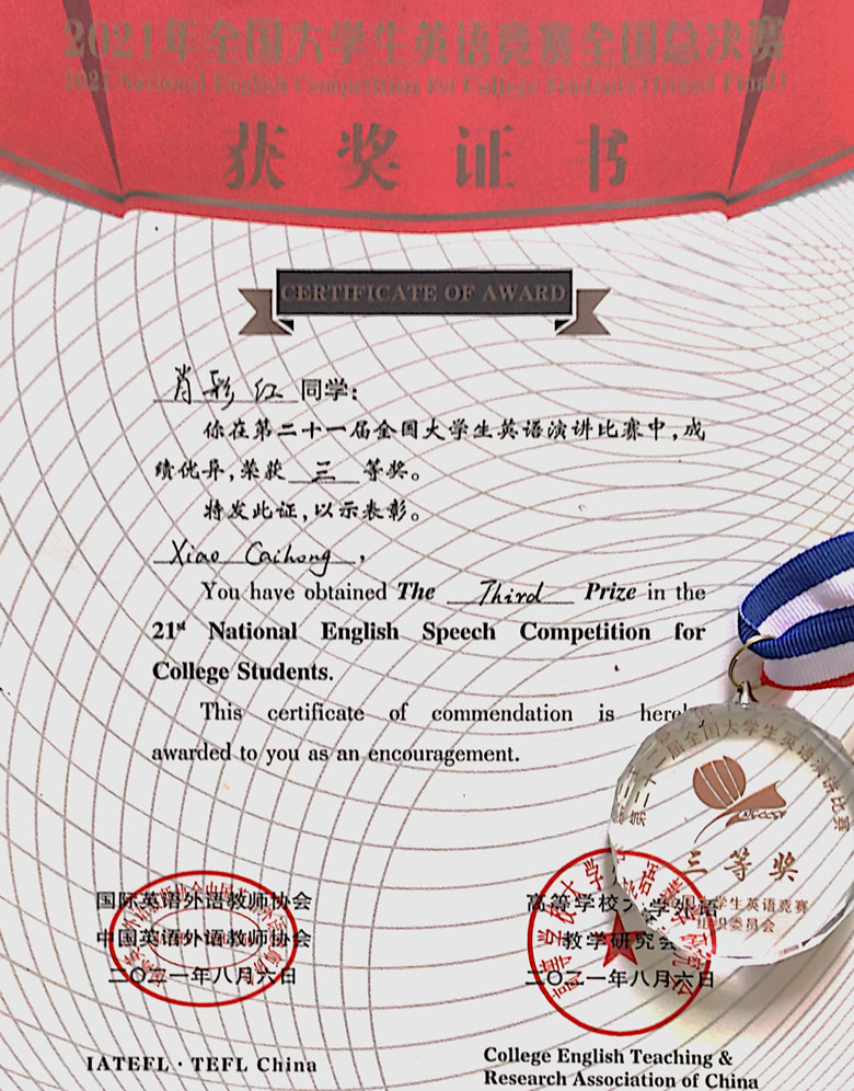 肖彩红获演讲比赛三等奖证书及奖牌