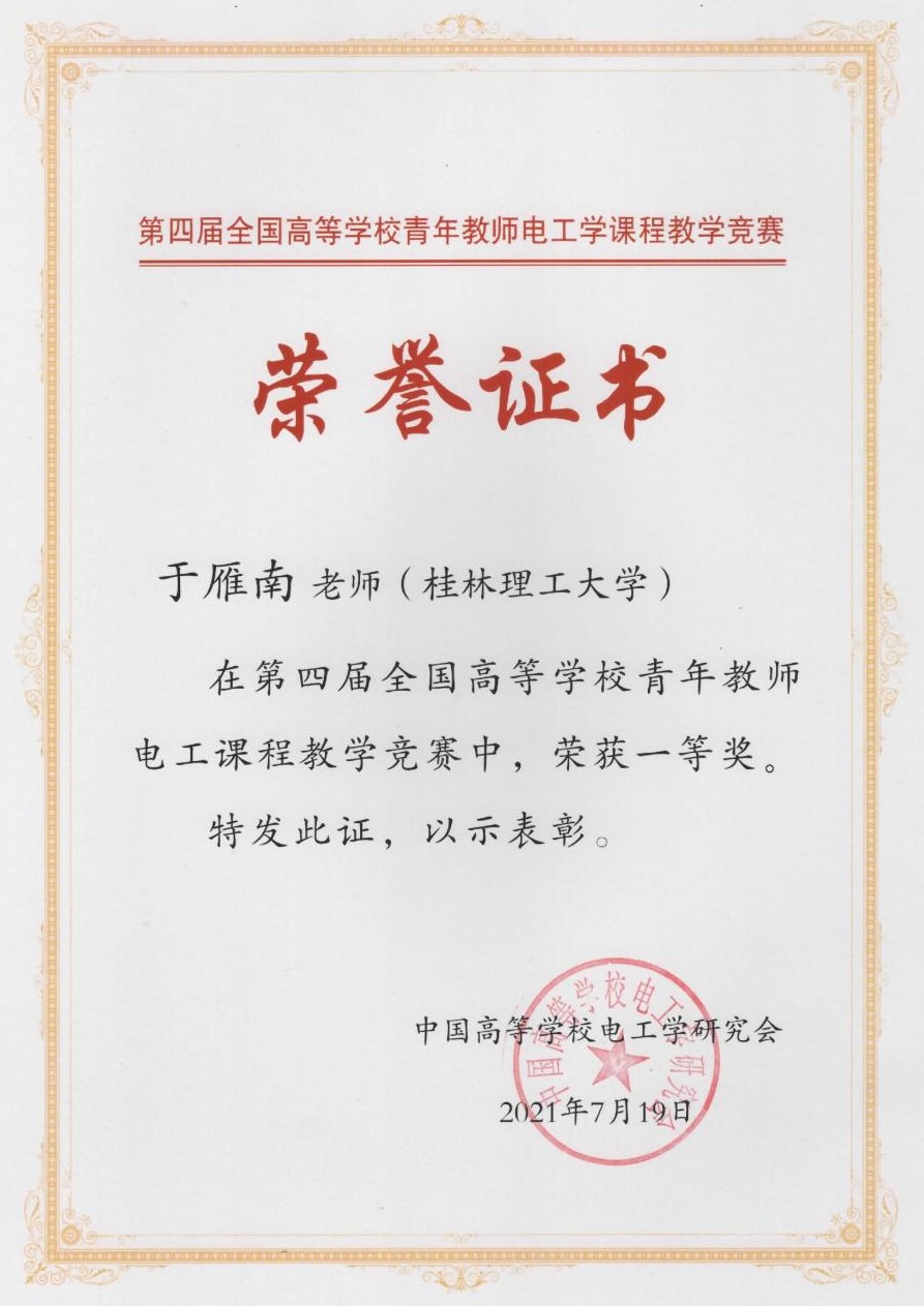 该项赛事每两年举办一次,初赛阶段在各省、自治区、直辖市内的高校进行比赛,并按赛会给出的名额选拔出参加决赛的选手。今年6月19日,广西高校电工学青年教师教学竞赛在beat365举办,于雁南老师荣获区赛特等奖,并作为广西高校唯一选送的参赛选手参加全国决赛。本届决赛阶段共有来自全国56所高校的58名选手参加了课程教学竞赛,决赛评出特等奖5名,一等奖10名,二等奖43名。