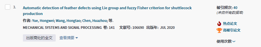 论文3:Automatic detection of feather defects using Lie group and fuzzy Fisher criterion for shuttlecock production,于2020年发表在Mechanical Systems and Signal Processing (SCI一区TOP,影响因子6.823)上,被引40次。