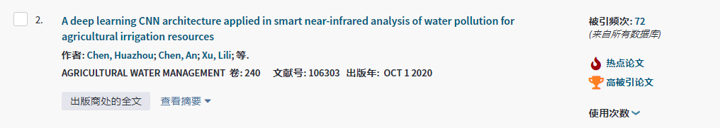 论文2:A deep learning CNN architecture applied in smart near-infrared analysis of water pollution for agricultural irrigation resources,于2020年发表在Agricultural Water Management (SCI一区TOP,影响因子4.516)上,被引72次。