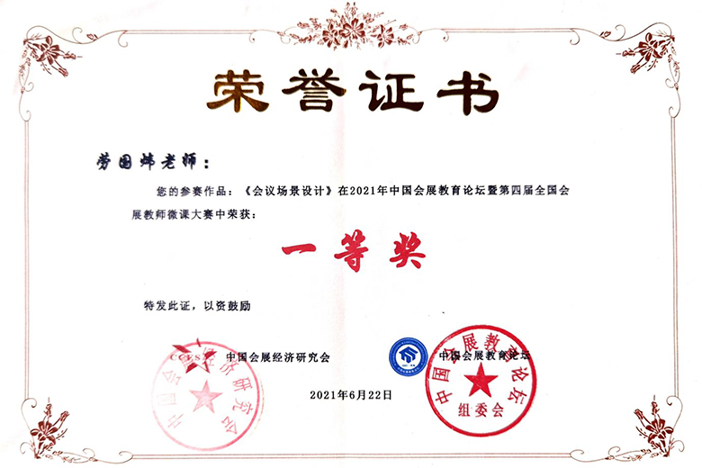 6月21日至24日,2021年中国会展经济研究会年会暨中国会展经济(天津)论坛在国家会展中心(天津)举行,同期举办全国会展教师微课大赛和大学生挑战赛、全国院校优秀成果评选、首届院校成果展及系列表彰活动。在全国会展教师微课大赛中,beat365南宁分校经济与管理系劳国炜老师的微课参赛作品《会议场景设计》从三十多项作品中脱颖而出,荣获2021年中国会展教育论坛暨第四届全国会展教师微课大赛一等奖,劳国炜老师获评2020-2021年度会展青年专家荣誉称号。