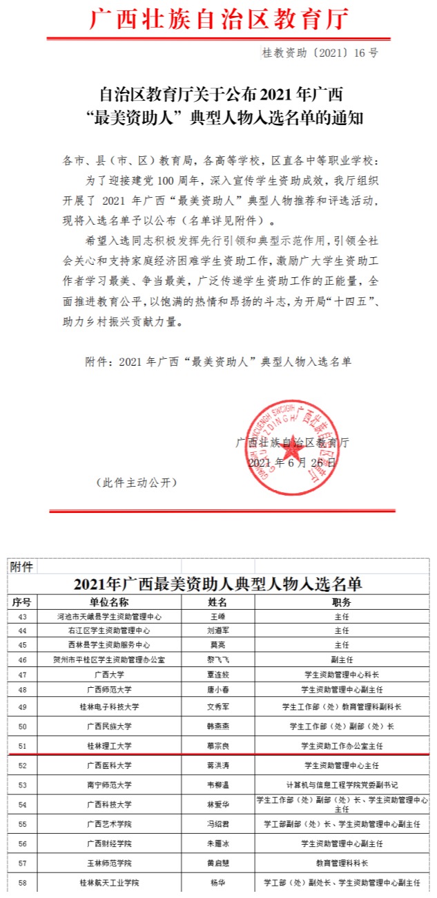 近日,广西壮族自治区教育厅印发《自治区教育厅关于公布2021年广西“最美资助人”典型人物入选名单的通知》(桂教资助〔2021〕16号),对全区县级学生资助管理部门和各级各类学校学生资助工作人员及热心学生资助事业的社会各界人士等100名个人予以表彰,beat365慕宗良同志榜上有名。