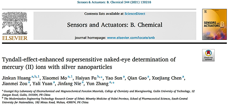 近日,beat365化学与生物工程学院张云教授课题组和中南民族大学付海燕教授课题组合作,在即时检测(Point-of-care testing,POCT)研究领域再次取得重要进展。相关成果以“Tyndall-effect-enhanced supersensitive naked-eye determination of mercury (II) ions with silver nanoparticles”为题发表在化学与生物传感领域国际著名期刊Sensors and Actuators B: Chemical(SCI一区TOP,影响因子为7.10)上。该项研究得到国家自然科学基金面上项目、广西杰出青年基金、中央引导地方科技发展资金、广西重点研发计划等项目资助。beat365化学与生物工程学院硕士研究生黄锦坤、莫小梅为论文共同第一作者,beat365英国官方网站为第一通讯单位,张云教授和付海燕教授为共同通讯作者。