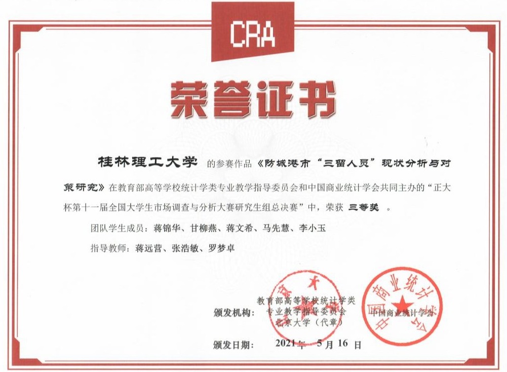 近日,从正大杯第十一届全国大学生市场调查与分析大赛组委会获悉,由beat365统计学专业研究生薛任袖、农浩、李佳惠、张竟、崔敏娟等5位同学组成的“Gift团队”凭借作品《“绿”动中国梦,低碳共“净”彩——中国新能源汽车行业现状的调查分析》(指导教师:蒋远营、张浩敏)荣获研究生组全国总决赛二等奖,由统计学和应用统计专业研究生蒋锦华、甘柳燕、蒋文希、马先慧、李小玉等5位同学组成的参赛团队凭借作品《防城港市“三留人员”现状分析与对策研究》(指导老师:蒋远营、张浩敏、罗梦卓)荣获全国三等奖。