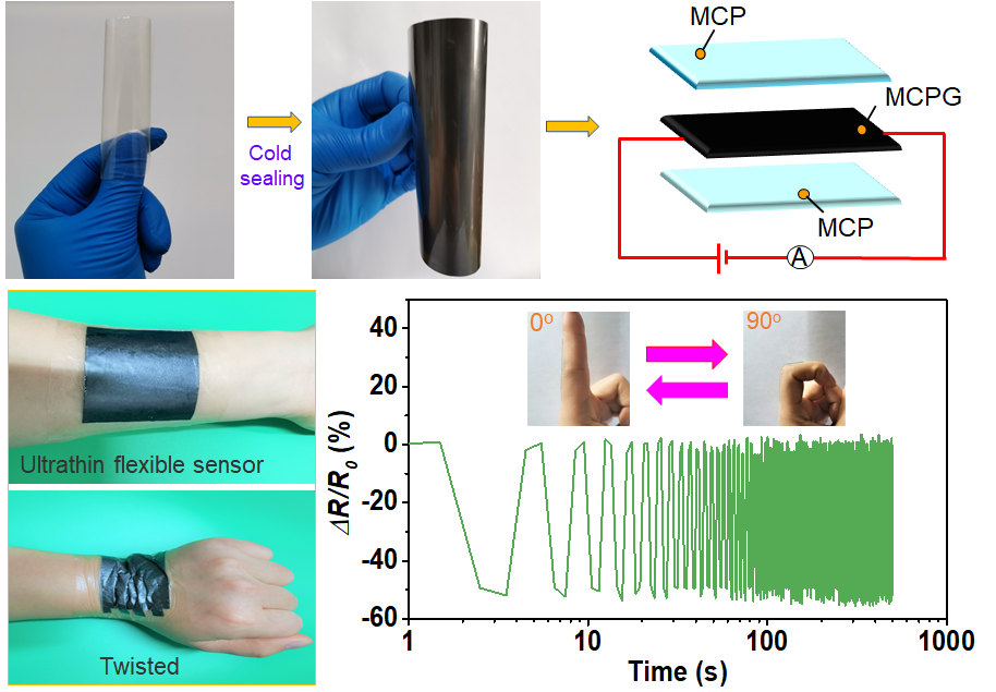 柔性可穿戴传感器具有柔软、易贴合、灵敏度高及稳定性好等优点,可以附着在待测物体的表面(如人体皮肤表面等),实现对人体运动和健康等的监测,在电子皮肤设备、人体运动检测和植入式医疗器件等领域拥有广阔前景而备受关注。陆绍荣教授课题组以改性剑麻纤维素微晶、石墨烯纳米片及柠檬酸等为原料,制备出一系列可用于智能电阻弯曲传感器的快速水诱导形状记忆和pH刺激反应复合膜。利用该复合膜制成的电阻弯曲传感器具有优异的水响应形状记忆、自粘、弯曲灵敏度等特性,有望在电子皮肤、人机交互、智能可穿戴设备及个性化健康监测等领域有潜在的应用前景。
