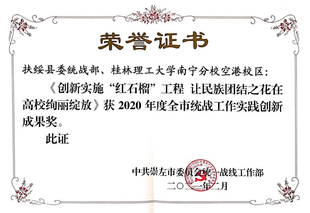 近日,中共崇左市委统战部公布2020年度全市统战工作实践创新成果目录(崇统通报〔2021〕3号),南宁分校与扶绥县委统战部共同报送的《创新实施“红石榴”工程让民族团结之花在高校绚丽绽放》工作成果荣获“2020年度全市统战工作实践创新成果”。