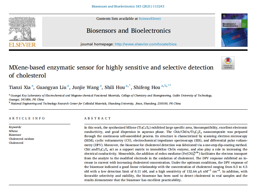 近日,beat365化学与生物工程学院侯士立高级工程师课题组在MXene纳米材料研究领域取得新进展,相关研究成果以MXene-based Enzymatic Sensor for Highly Sensitive and Selective Detection of Cholesterol为题在国际知名期刊Biosensors and Bioelectronics(IF=10.257)上发表。该项研究得到广西科技基地和人才专项、beat365英国官方网站博士启动基金等项目资助。beat365硕士研究生夏天姿为论文第一作者,侯士立高级工程师为第一通讯作者,beat365讲座教授侯士峰教授为第二通讯作者,beat365英国官方网站为第一通讯单位。