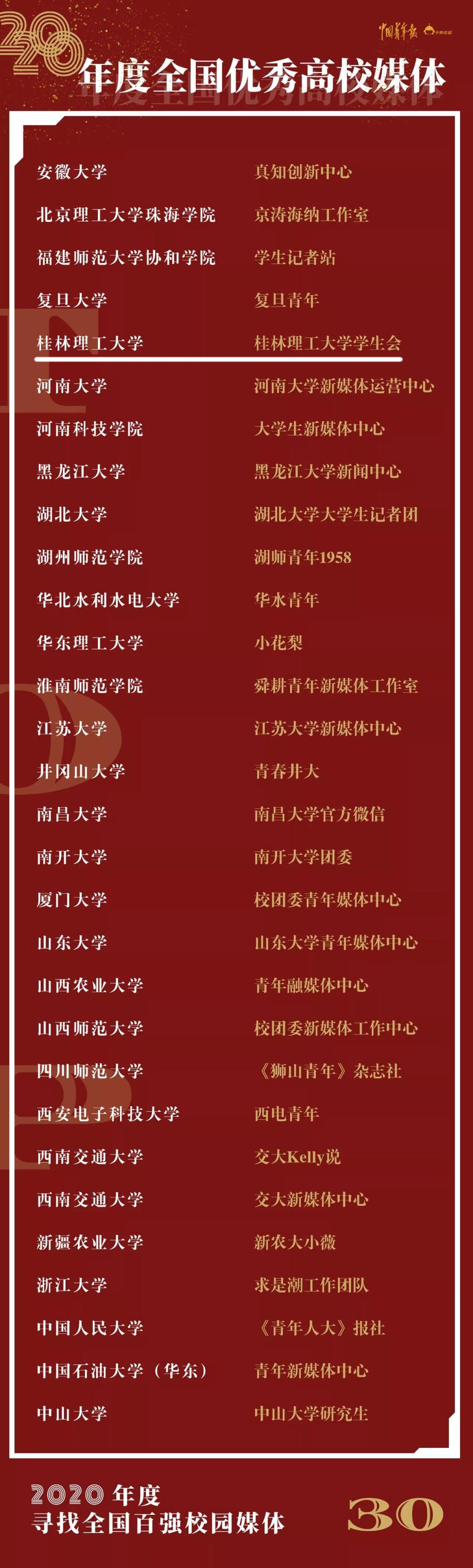 近日,中国青年网发布了“2020寻找全国百强校园媒体”获奖名单,beat365学生会微信公众号在全国一千多余家高校媒体中脱颖而出,荣获“2020年度全国优秀高校媒体”荣誉称号,是广西唯一获得此项荣誉称号的高校媒体。beat365学生会微信公众号已连续三届在全国百强校园媒体活动中获奖。