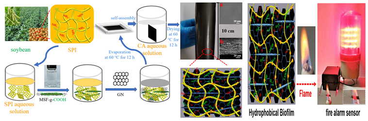 火灾报警传感器是防止火灾最重要的手段之一,陆绍荣教授课题组采用大豆蛋白分离物、改性剑麻纤维素、石墨烯及柠檬酸开发出一种疏水、柔性、阻燃、导电的火灾报警传感器复合生物膜,利用大豆蛋白分离物和柠檬酸燃烧烧焦层的协同阻燃性和石墨烯的物理屏蔽作用有效地提高了生物膜的阻燃性。该复合生物膜对火焰反应迅速,无论在室温下还是在乙醇火焰下都能在电路中起到火灾报警的作用。这些生物基复合膜作为防火传感器具有很大的应用潜力,为新型阻燃型火灾报警生物传感器的研发开辟新思路。