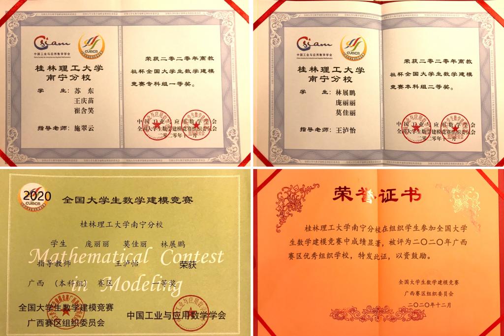 1月10日,2020年全国大学生数学建模竞赛广西赛区颁奖大会在桂林举行。南宁分校学子荣获专科组全国一等奖1项、本科组全国二等奖1项,创南宁分校在该项赛事获奖新纪录。南宁分校学子还荣获省部级一等奖2项,二等奖1项,三等奖3项。南宁分校获“优秀组织奖”。