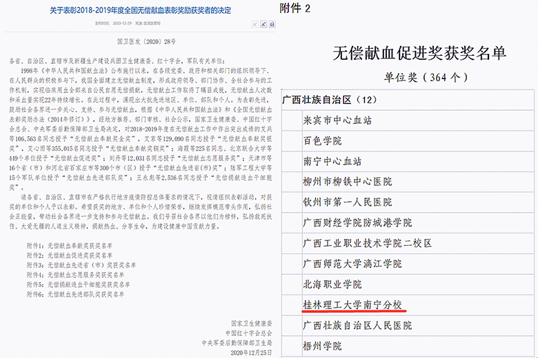 近日,国家卫生健康委员会、中国红十字总会、中央军委后勤保障部卫生局公布了《关于表彰2018-2019年全国无偿献血表彰奖励获奖者的决定》,beat365南宁分校荣获2018-2019年度全国无偿献血促进奖,这是南宁分校无偿献血工作获得的首个国家级奖励。