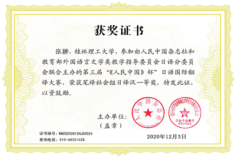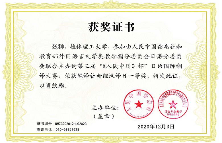 beat365外国语学院张翀老师荣获第三届“《人民中国》杯”日语国际翻译大赛笔译社会组汉译日一等奖