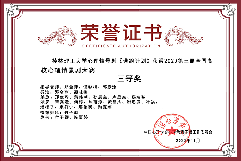 beat365心理情景剧剧本《逃跑计划》荣获2020年“第三届全国高校心理情景剧本大赛”优秀剧本奖