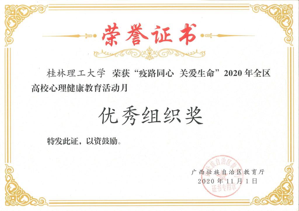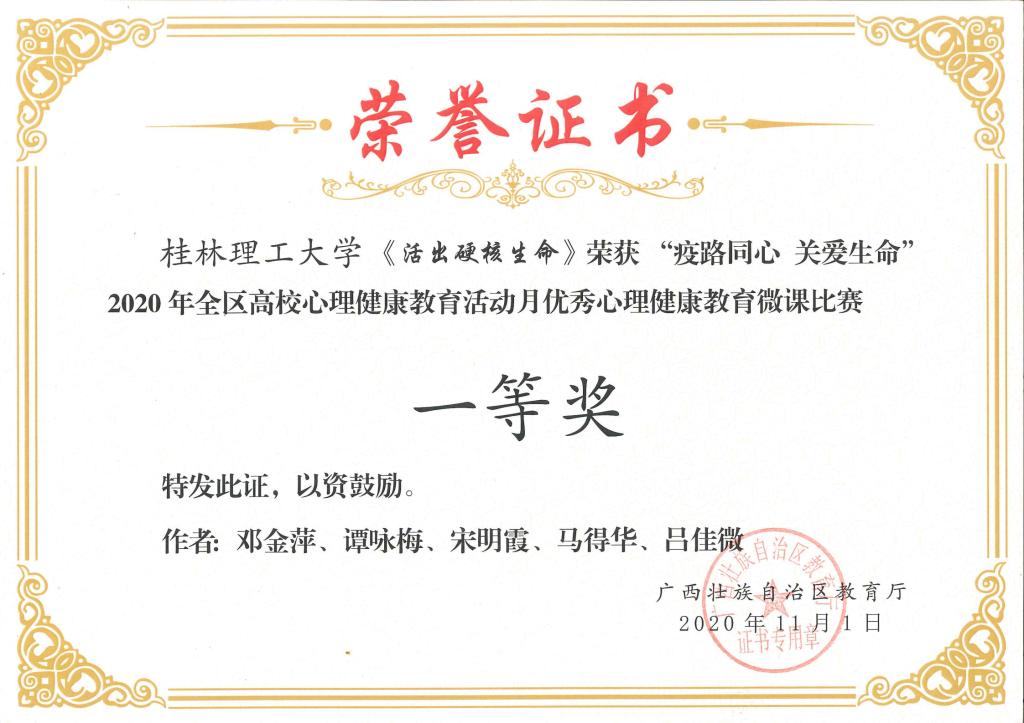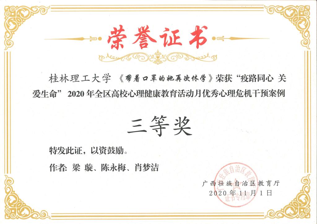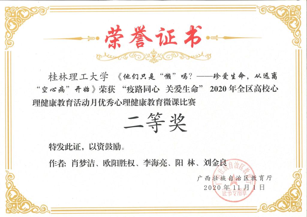 近日,自治区教育厅发布了《自治区教育厅关于公布2020年全区高校大学生5.25心理健康教育活动月主题活动获奖名单的通知》(桂教思政〔2020〕17号),beat365在活动中取得优异成绩。其中,邓金萍老师主讲的微课《活出硬核生命》获得心理健康教育微课比赛一等奖;肖梦洁老师主讲的微课《他们只是“懒” 吗?——珍爱生命,从远离“空心病”开始》获得心理健康教育微课比赛二等奖;朱司甲老师主写的心理危机案例《隔离不隔爱一一例疑似新冠密接者心理危机案例》获得心理危机干预案例比赛二等奖;梁璇老师主写的心理危机案例《带着口罩的她再次休学 》获得心理危机干预案例比赛三等奖。同时,beat365荣获2020年全区高校心理健康教育活动月“优秀组织奖”。