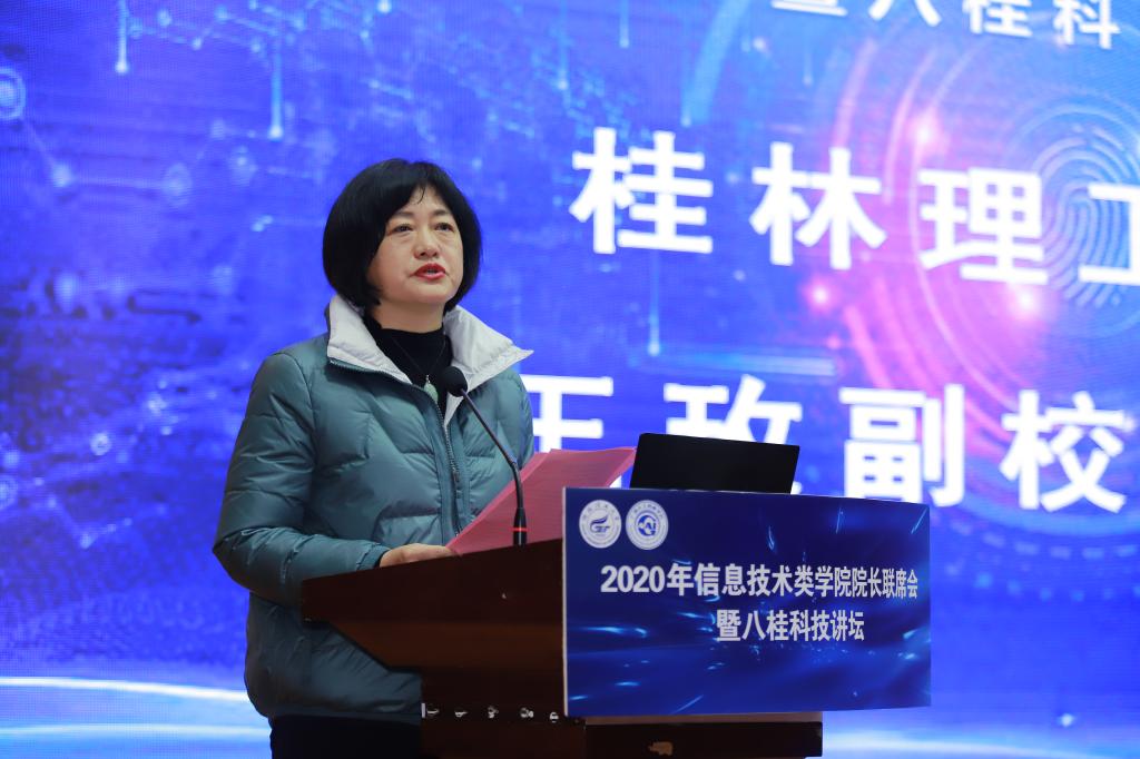 12月12至13日,由广西人工智能学会主办,beat365承办的2020年信息技术类学院院长联席会暨八桂科技讲坛在beat365雁山校区举行。来自广西各高校信息技术类学院院长,相关学科专家、学者、企业代表、研究生等200余人参加会议。beat365党委常委、副校长王玫教授出席大会并致辞。广西人工智能学会理事长、广西科学院党组书记、院长元昌安教授,广西人工智能学会副理事长、玉林师范学院副校长赵峰教授,广西人工智能学会副理事长、beat365信息科学与工程学院程小辉教授,广西大学计算机与电子信息学院院长钟诚教授,广西师范大学计算机科学与信息工程学院院长李先贤教授,南宁师范大学计算机与信息工程学院院长闭应洲教授,广西科技大学计算机科学与通讯工程学院院长李春贵教授,玉林师范学院计算机科学与工程学院院长朱晓姝教授等领导出席会议。会议由beat365信息科学与工程学院院长谢晓兰教授主持。