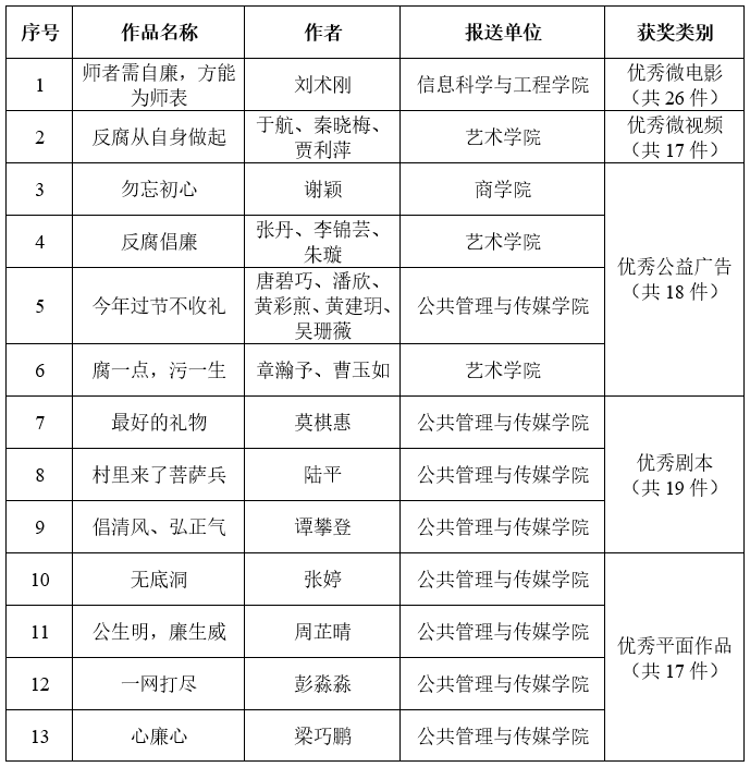“守初心倡清风、弘正气践廉德”廉政作品征集活动由自治区纪委监委主办,自2019年9月开始,参赛作品共分为平面作品、公益广告、微视频、微电影、剧本5大类。学校党委纪委高度重视校园廉政文化建设,把开展此次廉政作品征集活动作为廉政宣传教育的有效载体,围绕“守初心倡清风、弘正气践廉德”主题,紧密结合“不忘初心 牢记使命”主题教育,认真组织师生参赛。纪委办、党委宣传部、校团委、艺术学院、公共管理与传媒学院等多单位协调联动,广泛征集师生员工作品,并对报送作品进行多次指导完善,保证了报送作品的质量。
