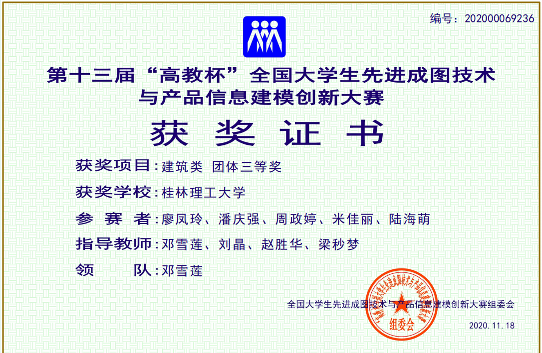 11月14日,由教育部高等学校工程图学课程教学指导委员会、中国图学学会制图技术专业委员会、中国图学学会产品信息建模专业委员会联合举办的第十三届“高教杯”全国大学生先进成图技术与产品信息建模创新大赛决赛在线上进行。本届大赛共有395所学校、647支参赛队伍、4538名学生、2322名教师参赛。beat365机械与控制工程学院13名学生参赛,其中12名学生分别获得二等奖5项、三等奖7项,5名学生以第117名的成绩获得团体三等奖,实现了历次参赛以来在该奖项上的突破;beat365土木与建筑工程学院学子获得二等奖2项、三等奖4项及团体三等奖。beat365是广西唯一获得团体奖的院校。