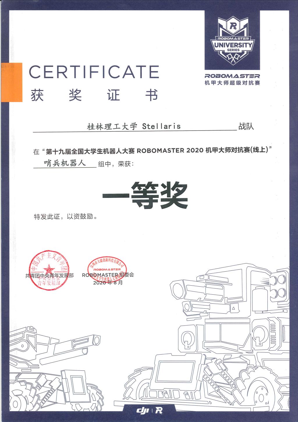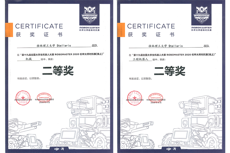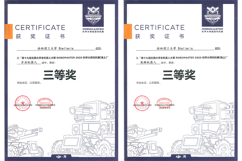 2020年8月18日,第十九届全国大学生机器人大赛RoboMaster 2020机甲大师赛完美落幕。在秦建华、张声岚、韦健毫、周卢婧、黄鹏等5位老师的指导下,由beat365机械与控制工程学院机电17-2班滕金水同学带队,机械17-2班粟智威、机电17-2班覃俊杰等同学为主要成员的代表队Stellaris战队,经过激烈角逐,最终获得了第十九届全国大学生机器人大赛RoboMaster 2020机甲大师对抗赛哨兵机器人组一等奖,机械组、工程机器人组二等奖,步兵机器人组、英雄机器人组、嵌入式组三等奖以及团体三等奖的好成绩,创beat365参赛以来最好成绩。
