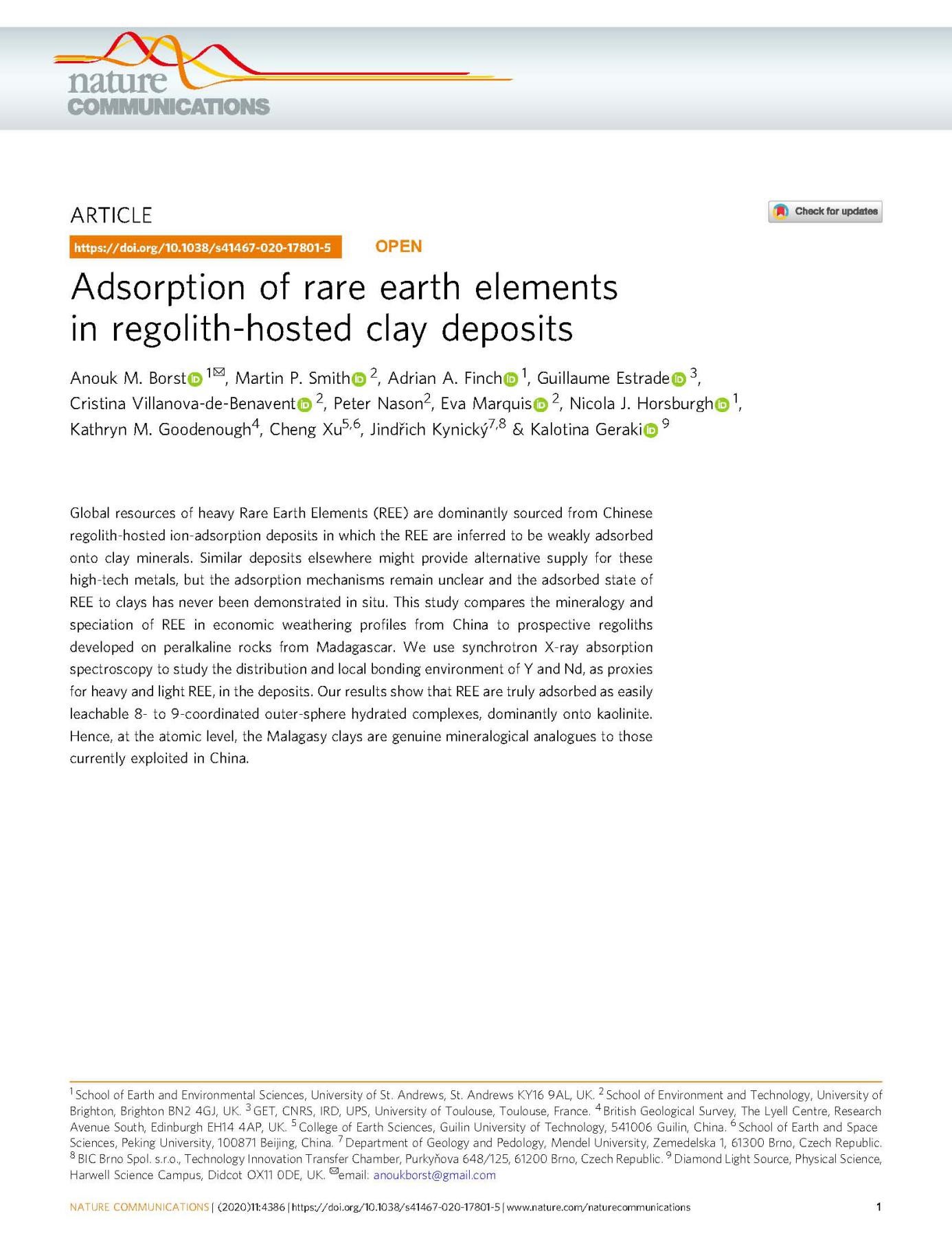近日,英国圣安德鲁斯大学Borst博士与beat365许成教授合作,通过对比研究我国江西和马达加斯加富重稀土风化壳的重稀土赋存状态,发现两地重稀土均以8到9配位的含水络合物吸附于高岭石表面,而这个配位数的稀土最容易解体浸出,这为寻找具有经济价值的重稀土矿床提供了重要的理论支撑。2020年09月01日,上述成果以标题为“ Adsorption of rare earth elements in regolith-hosted clay deposits ”在英国《自然》子刊《自然通讯》(Nature Communications)上发表。